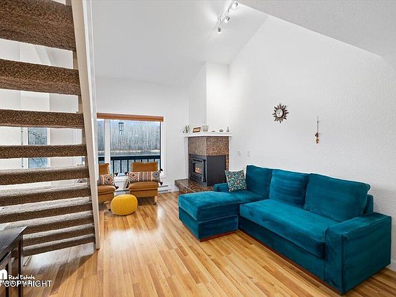 Tastefully updated 2 bed, 2 bath condo featuring a living room with a cozy fireplace and soaring vaulted ceilings. The updated kitchen flows into a charming dining area perfect for soaking in the lake and mountain views or enjoying the serene patio. The master bedroom offers vaulted ceilings and a private en-suite bathroom.An added finished loft area, accessible by stairs, serves as an ideal office space or bonus room to suit your needs. Experience the joys of lakefront living with year-round outdoor activities right at your doorstep, including paddleboarding, kayaking, skating, walking, and running. A secure, large storage room is located on the first floor along with one parking space in the heated garage and one assigned parking space outside. This prime location is just a short drive from UMED, JBER, Midtown, and Downtown!
