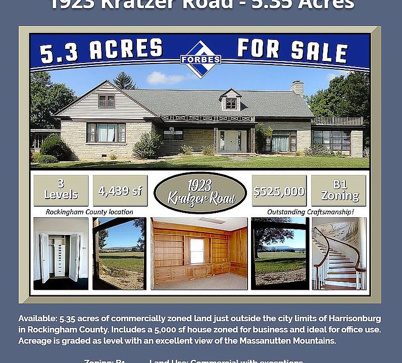 1923 Kratzer Road - 5.35 Acres Available: 5.35 acres of commercially zoned land just outside the city limits of Harrisonburg in Rockingham County. Includes a 5,000 sf house zoned for business and ideal for office use. Acreage is graded as level with an excellent view of the Massanutten Mountains. Well and Septic but has access to public water and sewer. Zoning: B1 Land Use: Commercial with exceptions