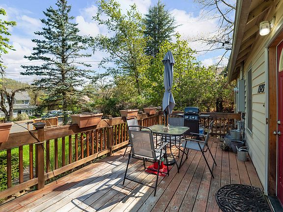 Charming main home is 1026sf on .25 acre on a large fenced corner lot. Main house has 2 bedrooms, a bonus room, 1 bathroom and a spacious deck overlooking the yard. Lower unit is 400sf with a kitchen area and bathroom. Upper unit is 628sf with a living room, bedroom and kitchen and a beautiful deck. Potential for multi family or stay in main house and rent other units. Many possibilities. Anyone considering the purchase of this property should perform their own investigation into the uses and conditions of the property.