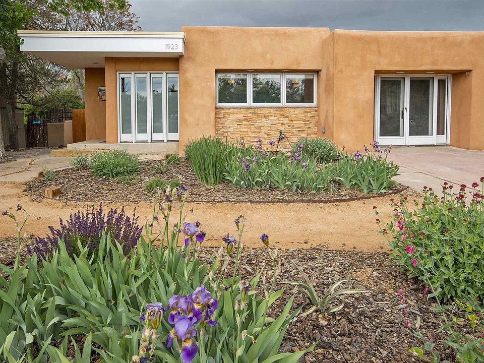 An elegant stone façade exterior welcomes you to your new home! Located in central Santa Fe is a remodeled Stamm with a modern style! The large, open kitchen enjoys stainless appliances and concrete counter tops. There is a spacious den or family room with kiva fireplace that creates two spaces for entertaining or living. Structurally solid with Pella windows, big skylight that washes the wall with light. Nicely tiled baths have a fresh updated look. There are three bedrooms, living room, dining room and hallway all have hardwood floors. There are two bathrooms, one is ensuite in the master. The home has 1,591 square feet of heated living space. There is also a heated studio with approximately 300 square feet of heated space, for work or play. The back yard is adjacent to a green belt, providing a little extra nature. Easy to show and ready right now!