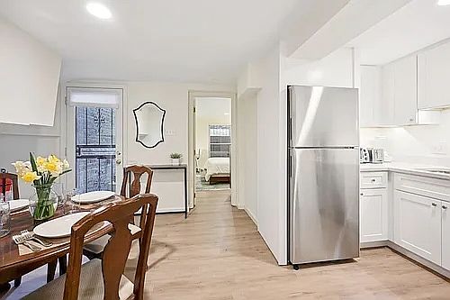 This renovated Victorian townhouse apartment features a spacious living room with a bay window, leather couch, and Smart TV. The fully equipped kitchen has new stainless steel appliances, Quartz countertops, and all necessary amenities. Enjoy meals in the adjacent dining area. The cozy bedroom, decorated in calming green, offers a queen-sized bed, walk-in closet, and a workspace with strong Wi-Fi. The modern bathroom includes a walk-in shower and toiletries. A washer and dryer in the unit are also provided. Located near Dupont Circle, Logan Circle, and U Street, this apartment is perfect for two, with dining, shopping, and Metro stations nearby.