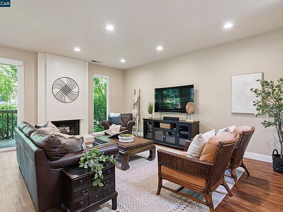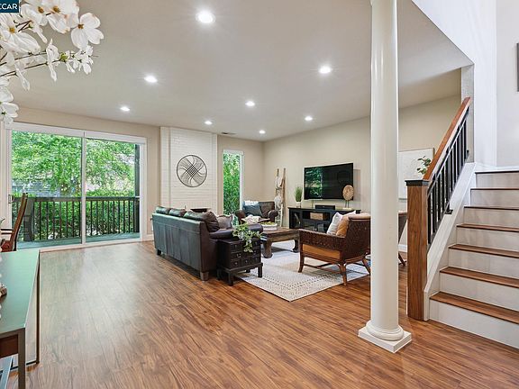 Highly sought-after 2,433 sq townhouse in coveted Summit Ridge ideally situated on peaceful cul-de-sac. The serene entrance leads to the natural light-drenched kitchen with informal dining area, stone countertops, white shaker cabinetry and stainless-steel appliances. The open floor plan affords the formal dining room views of the lush landscaping through sliding glass doors leading to the secluded deck. The large living room has a fireplace, high ceilings, and recessed lighting. Two spacious guest bedrooms include large closets with ample storage centrally located next to hall bath with dual sink vanity and shower over tub. The palatial primary suite offers private balcony amidst mature trees, fireplace, bonus sitting space, walk-in closet and spa-like bathroom including jetted tub, oversized shower, and modern dual vanities and light fixtures. Additional features include separate laundry room, scraped hard wood floors, dual-pane windows, spacious 2-car garage, new exterior siding, and more. The entire home is awash with sunlight and is ideally located close to top rated schools, freeway access, BART, shopping and hiking trails with community amenities including pool, remodeled clubhouse, and beautifully maintained greenbelt and walking paths.