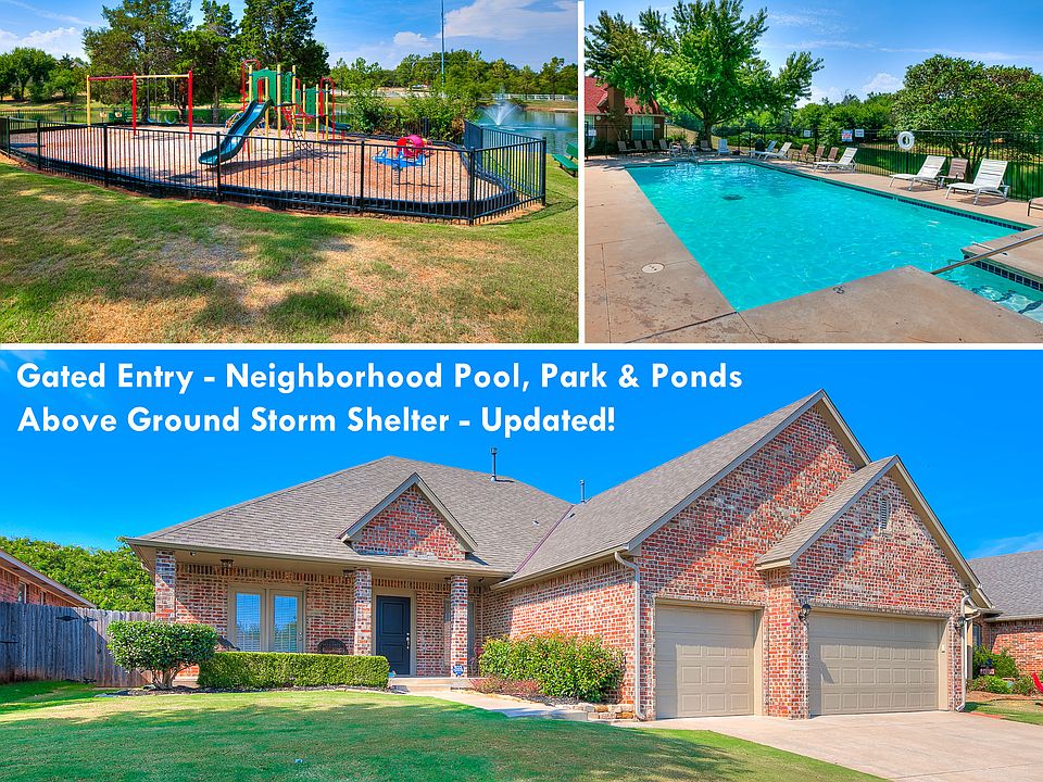 Immaculate home with many nice updates including freshly painted woodwork and walls. White cabinets, doors, and trim with gray walls. Very nice laminate wood floors in living, dining, and bedrooms, with tile in kitchen and baths-no carpet! This is a great split floor plan with the master down one hall near the laundry room, and two bedrooms and bath on the opposite side. The kitchen is extra wide, you have to see! Three car garage hard to find at this price point! Standing storm shelter is in third bay of garage. The neighborhood is gated, has pool-clubhouse-playground, and two ponds for your enjoyment. Excellent schools and near Covell shopping, YMCA, and every nice amenity Edmond has to offer. Must see today! Check out the video in virtual tours!