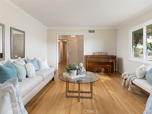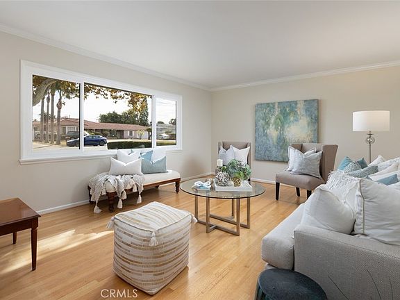 In the highly desirable West Floral Park neighborhood, this traditional mid-century home exudes charm and warmth throughout. Step through the inviting double doors into a welcoming foyer, setting the stage for a home filled with character and timeless details. The formal living room boasts crown molding, gleaming original hardwood floors, and abundant natural light from newer large windows, while the open concept den and dining room offer wide-plank hardwood floors, rich wood paneling, and a beautifully painted brick fireplace as its focal point, featuring a wide, curving hearth and wood mantle. The dining area has a vintage built-in buffet & cabinet and overlooks the sparkling pool and backyard oasis. The kitchen preserves its mid-century charm with ceramic tile counters featuring fanciful accent tiles and counter space galore. Plentiful cabinet space for your chef in the reliable original wood cabinets. Practical and stylish, the eat-in counter is shared on both sides in the den & kitchen and complements the mid-century vibe. The laundry room just off the kitchen provides additional storage and convenience. Four spacious bedrooms with hardwood floors and ample closet space. The primary suite features view of the pool area, two double-door closets, an additional closet, and access to a Jack-and-Jill bath with vintage seafoam green tile and a shower stall with a built-in seat. Another bedroom enjoys the poolside view with abundant natural light, while the front bedroom captures morning sun. An expansive walk-in linen closet in the hallway adds to the home’s generous storage. The hall bath has neutral vintage tile surrounding the room and a bathtub with shower. The unique, angular pool design carries the mid-century style outdoors and is surrounded by a stylish cement deck, perfect for entertaining. A covered patio invites relaxation, with an adjacent grassy area, citrus and camelia trees, and a charming partially covered patio for versatile outdoor enjoyment. This home embodies the ideal blend of classic graceful style and traditional yet open floorplan, ready to be cherished for years to come. The West Floral Park neighborhood has tree-lined streets full of vintage homes and architecture, and has events to enjoy such as Open Garden Day. Santiago K-8 is walking distance with a fulltime GATE program and an amazing drama program. OC School of the Arts, OCSA is just minutes away, as is easy freeway access and great shopping and restaurants!