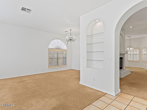 Resting proudly on a large corner lot just a block from Memorial Medical Center, this beautiful home is move-in ready. The formal living and dining areas glow with natural light streaming through arched radius windows, many with plantation shutters. A cozy family room with fireplace opens to the kitchen via the breakfast nook. Kitchen provides all appliances and solid surface counters with integrated sinks, echoed in the bathrooms. A third bedroom sits beside the foyer and doubles nicely as an office with a built-in bookshelf in place of the closet. The primary suite offers access to the extended back patio, while its spa-like bath showcases dual vanities, a central makeup counter, jetted tub, separate shower, and cedar-lined walk-in closet. Skylights illuminate the hall, complete with glass display shelving. Outside, enjoy raised garden beds and a double side gate. The community is highly accessible, minutes from NMSU, golf courses, shopping, dining, and both major interstates. *some photos are Ai Staged*