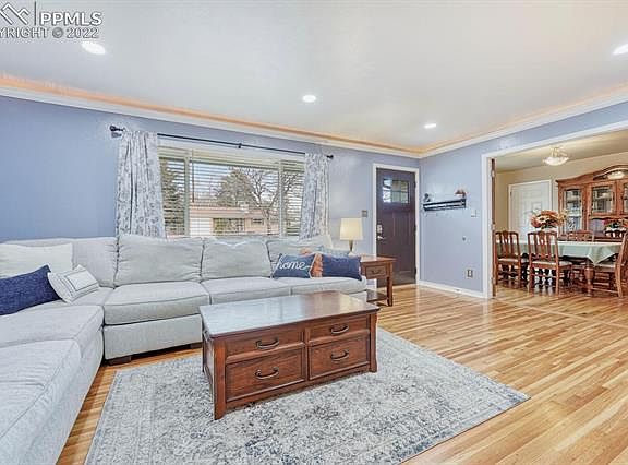 Beautiful updated ranch style home in the desirable Palmer Park neighborhood. Bright and open main floor has a large family room, dining room and kitchen with an island, large walk-in in pantry, all appliances are included and a walk-out slider to the backyard. It also has 3 bedrooms and 2 baths on the main. The front bedroom by the family room has french glass doors and can be used as an office or a formal dining area as well. Beautiful wood floors throughout main floor, crown molding w/back light, a whole house fan, a humidifier, an updated bathroom and a gorgeous new wood front door. From the back of the home you can walk right out to the private large treed back yard with Pikes Peak mountain views. Amazing multi-tiered partially covered wood deck with outdoor kitchen, a separate large covered pergola on a stone patio sitting area, manicured lawn with an automatic sprinklers system and 2 sheds. Downstairs boasts a large family room with a beautiful brick wood burning fireplace with a wood mantel and raised hearth. An amazing master bedroom suite with crown molding, cove lighting, large custom walk-in closet, attached luxurious custom spa bathroom with a steam shower, tile bench & floors and a pedestal sink. Master bedroom also has a separate sitting area with entrainment built-ins. Laundry room with shelves, flex room that could be used for an office/craft/work-out room, and a large walk-in storage room with shelve. One over sized car garage with service door to the back yard and work bench area. Great location! Easy access to Powers and Academy. Close to shopping and restaurants.