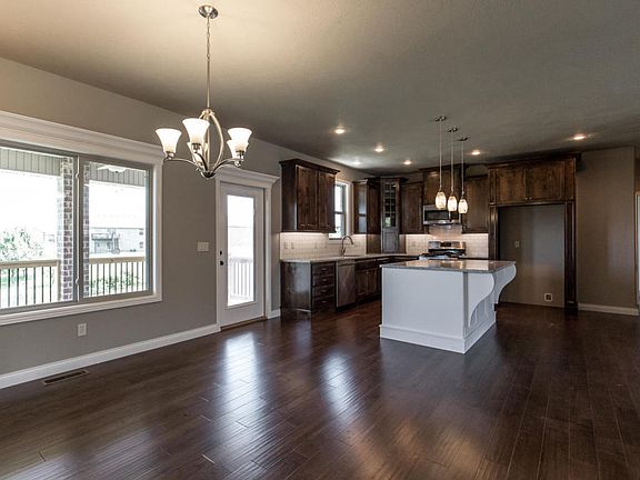 Transitional style in Nixa schools! All brick walkout basement offers open concept, split bedroom plan. Large open kitchen has custom, painted cabinets, 4x8 center island, granite counters, custom backsplash, stainless appliances including gas range, and large pantry. Master bedroom has hardwood floors, bath has tiled shower, his/her vanity with granite top, and huge walk-in closet. Basement offers two additional bathrooms, wet bar, stone fireplace, and 15x16 John Deere room. Other features include covered deck plumbed for gas grill, irrigation system and sodded yard. Gated subdivision is master planned community offering in-ground pool, trash pickup and snow removal.