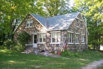 Stone House.. Large home (1092 sq.ft.) with full basement & garage on 7.6 acres. 2 story, 5 bedrooms plus other rooms for office/hobbies, full basement & sauna, open living/dining, lots of windows, newer garage, orchard, flowers, grapes, maple trees & 7.6 acres West of Hillman. Please call or e-mail for map, information sheet, aerial view and more pictures.