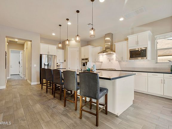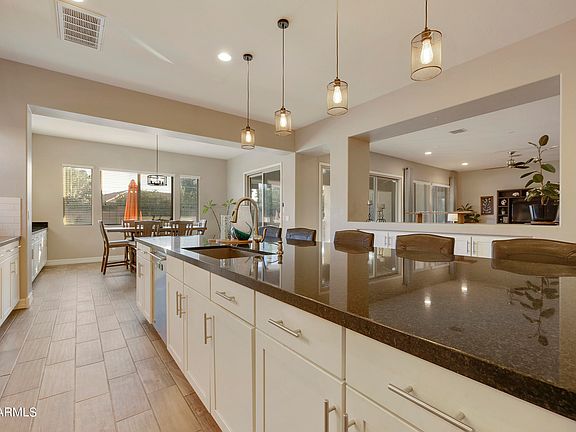 Entertainers delight inside & out! This stately single level home offers ample living space with 4 bdrms & 4.5 bths. All bedrms have a private bath. The great room plan offers a formal dining with butler's pantry along with a den/flex room. Split from the main part of the house is the teen room with the 3 secondary en-suites with private baths & walk-in closets providing versatile living options. The home's interior is highlighted by a gourmet kitchen with an oversized island, white cabinets, SS appliances (a gas cook-top, stainless steel mounted hood) along with a pot filler & lg W-I pantry. The lg primary bdm boasts a sitting area, a spacious W-I closet with organized shelving, & a luxurious bthrm with separate vanities, separate soaking tub and tiled shower. Outdoors, the property..... offers a generously sized backyard with a custom pool with pebble tech finish & baja step and extended paver patio. The lg C shaped BBQ island boasts a sink, burner, & storage drawers along with extended ramada & will be a focal point for entertaining. There is a grassy play area & space for a fire pit. The lg lot provides ample room to build a casita or an additional RV garage. The home is situated in a gated community close to the vibrant town of Gilbert and the growing Queen Creek downtown hub.