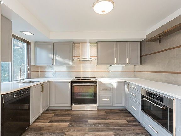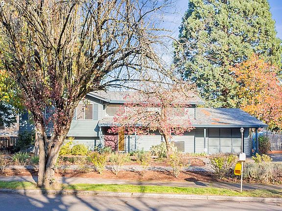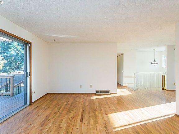 The Portland split-foyer home offers hardwood flooring in select rooms, a wood-burning fireplace, a back deck, and a one-car garage.