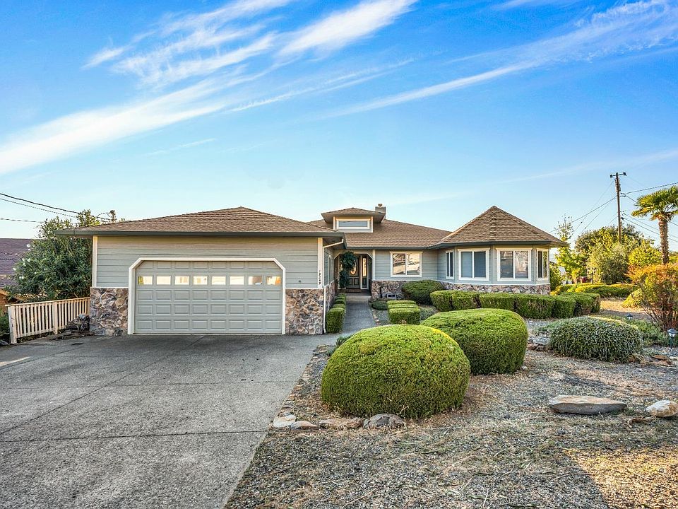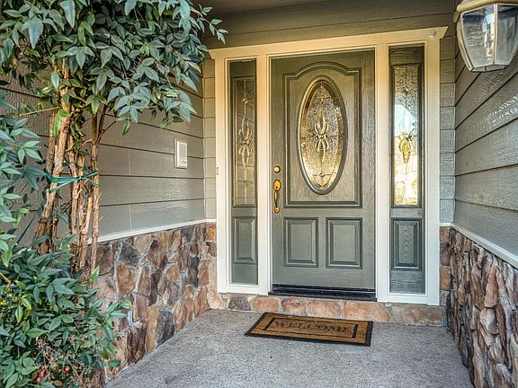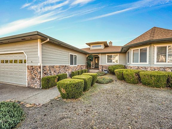 Simply stunning on Stonegate! This expansive, single-level home sits on an oversized corner lot & offers comfort, views, upgrades & even OWNED solar! Formal entry w/dramatic two-story ceiling. Living room has vaulted ceilings, vinyl plank floors, built-in cabinetry with dry bar & gas fireplace, & large picture windows to capture the views. Grand kitchen has professional-grade six burner gas stovetop with stainless steel hood, built in oven, plenty of cabinetry, breakfast bar & cheery garden window. The dining room captures those same lake & mountain views & also enjoys a built-in desk area. A bonus family room/office with built ins could be finished off to create a fourth bedroom, and has its own full bathroom with oversized stall shower. 3 extra large bedrooms plus 2 more full bathrooms, including a gorgeous primary en suite with extra long jetted tub, dual sinks, privacy water closet and walk in closet with built ins. The covered back deck runs the length of the home and is the perfect spot to soak in the gorgeous views. Easy, low-maintenance lot with fruit & olive trees & plenty of extra parking. Whole house central vacuum, intercom system, wiring for surround sound, and an OWNED solar system! This is a must-see!