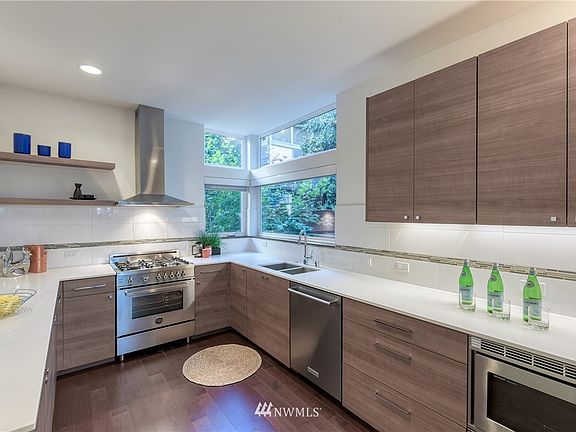 Enjoy stunning sunsets over the Olympics and Puget Sound from your expansive rooftop deck near the peak of W Queen Anne. The incredible location has easy access to downtown, and so many choices for coffee, restaurants, shops and famous parks, just blocks from your door. Entering at your private courtyard, this light filled townhouse with SW exposure welcomes with floor to ceiling windows, a chef's kitchen with a layout for entertaining, and a half bath. The top floor bedroom suite has its own covered deck, huge walk in closet with custom built-ins, and an incredible bathroom with luxurious shower and dual vanity. The lower level features a second bedroom and full bath along with your private garage with easy access and added storage.