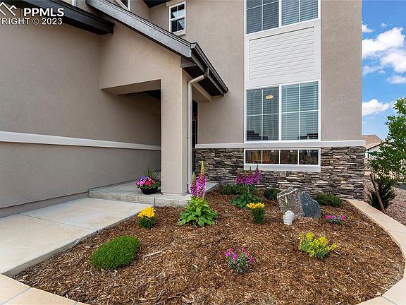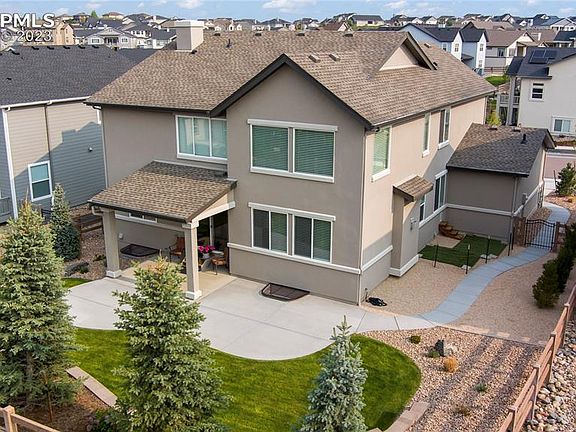 Don’t miss out on this exceptional fully landscaped 5 bedroom, 5 bathroom home with upgraded finishes throughout, located in the Palermo neighborhood of Flying Horse. Enjoy Pikes Peak views from the fabulously oversized back patio ready for entertaining and games on the lawn. Maximum outdoor entertainment capability is offered with the tastefully finished softscape and hardscape of the fenced backyard. A stunning two story, washed stone fireplace is a primary feature on the main level, which offers thoughtful space planning for work at home with two fully functional office's in different locations on the main level, both with french doors! Solid wood flooring throughout this level. Gourmet kitchen is fully equipped with quartz counter tops, 42" custom cabinetry, upgraded stainless steel appliances and a deep walk-in pantry for all your food preparation needs. The functional layout supports everything from intimate fine dining to large group entertainment. Views of Pikes Peak await you in the spacious primary bedroom suite with adjoining bathroom and large custom stand-alone shower, quartz counter tops and dual sinks, as well as a large walk-in closet. The secondary bedroom suite offers an adjoining bathroom with stand-alone shower and quartz countertop. Two more bedrooms complete the second floor living with a shared bathroom and dual vanities with quartz countertops. The basement boasts a large family room and game area/built-in bar space where your family can unwind and relax. Lower level features yet another large bedroom. The multi-purpose room on the lower level is fully finished with luxury vinyl tile flooring offering flexibility to suit your needs. The garage is fully finished with drywall, insulation, epoxy flooring, and two 220 outlets for your car charging needs. Backyard landscaping includes several oversized Colorado Blue Spruce for privacy. If you’re looking for a family friendly space in a highly desired neighborhood, welcome home!