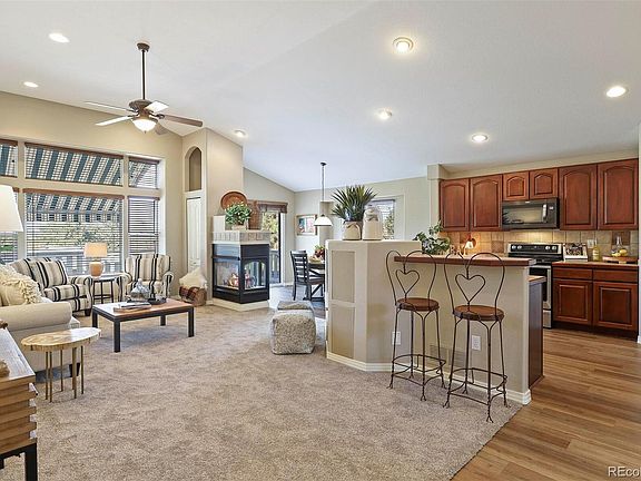 Book your tee time and check all your boxes with this lovingly maintained and updated home with main-floor living. Inside, vaulted ceilings and large windows brighten the comfortable living areas including the great room, well-equipped kitchen, office, and a huge basement bonus room featuring a rough-in bath. Positioned next to a greenbelt, benefit from easy access to the community's sidewalks, while the adjacent guest parking caters for entertaining. From the front, enjoy peak-a-boo views of the 17th hole and its reflections over a lake, while views of "The Rock" dominate across the fairways. The great room and kitchen are open and sunny! A two-sided gas fireplace warms the room while the center island features a concealed entertainment nook to save on space. The kitchen is highlighted by Whirlpool® appliances, plenty of prep and storage space, an eat-in nook with access to the full-length deck, plus an adjacent formal dining area. Easily work from home in the office with a built-in desk and storage. Both bedrooms are comfortable and spacious, while the master features additional deck access plus a 5-piece bath with soaking tub, shower with bench, and walk-in closet. Relax outdoors on the back deck, where a retractable sunshade provides year-round enjoyment. The fenced yard is low-maintenance with still enough room for garden beds. Side gates lead to the surrounding greenbelt, where you can easily stroll the neighborhood sidewalks. Enjoy the fantastic and friendly community close to downtown Castle Rock with an easy commute to Denver and Colorado Springs. Make this treasure yours!