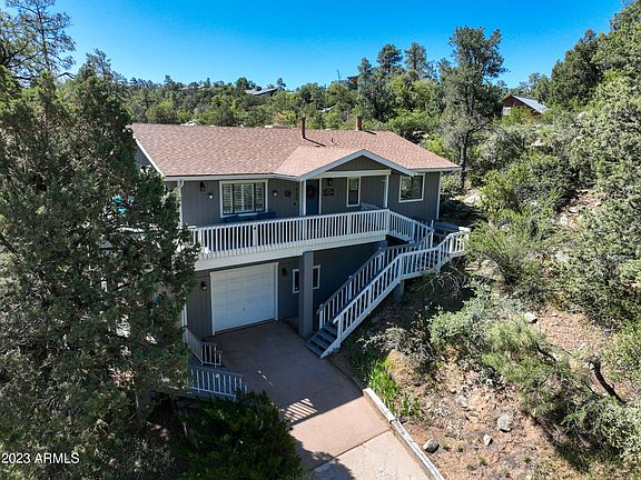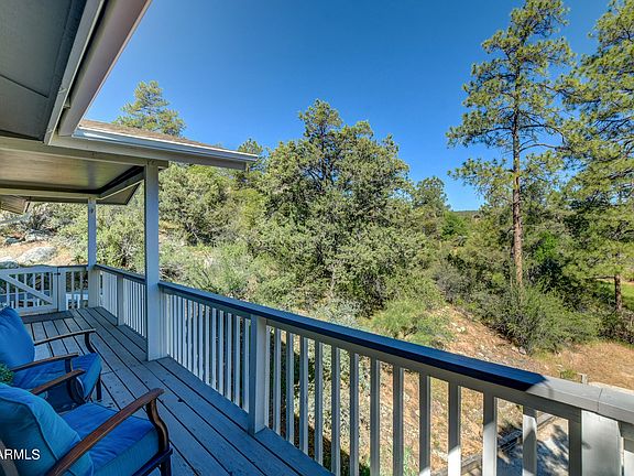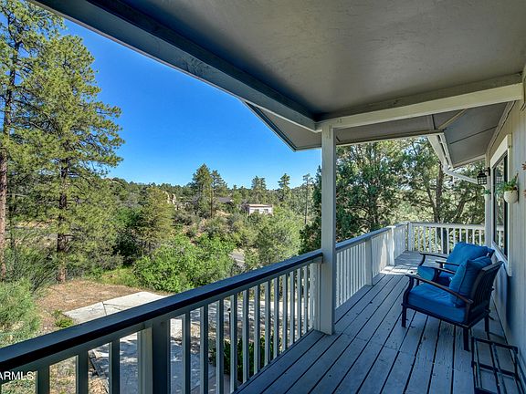 Cabin in the Pines with VIEWS of Thumb Butte on just shy of an acre. Lots of outdoor living space with an upstairs wrap around deck, large covered downstairs deck, and outdoor patio. Come escape the heat and enjoy peace and quiet in the pines just 1 1/2 hrs from Phoenix. New luxury vinyl flooring, neutral paint, premium carpet, recently fully remodeled bathrooms. Kitchen partially remodeled in 2019 and all kitchen appliances replaced with new. Two spacious bedrooms with walk in closets on main level. Downstairs features a large basement-like bonus room with plenty of space for 2 double bunkbeds, electric fireplace, large sectional, dining table, and more. Property is approx. 1 mile from Thumb Butte Trailhead and 2 miles to downtown Prescott.