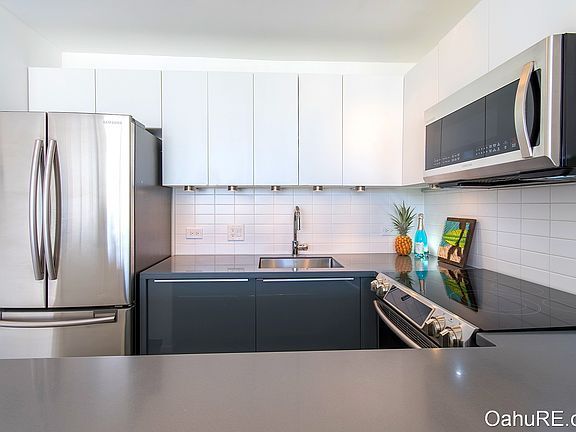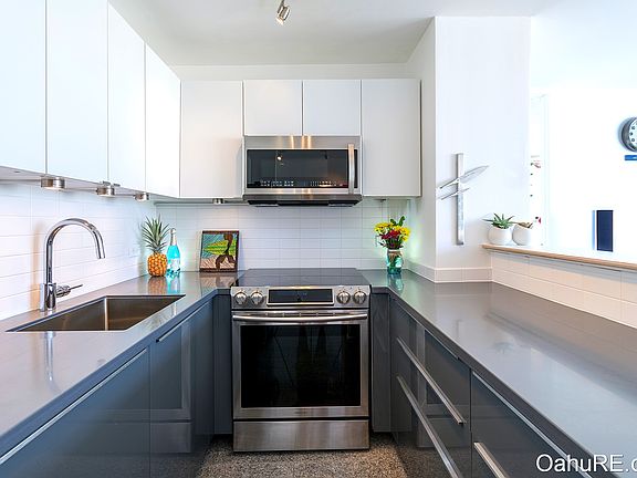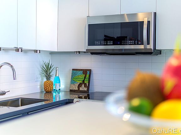 Modern island living in Waikiki. Fully upgraded high floor unit. Floor to ceiling windows with mtn view and lanai. Kitchen w/ granite floor & Staron countertops. High end Samsung microwave, stove and refrigerator w/ice and Bosch integrated dishwasher. Living rm and bedroom w/French white oak hardwood floors. Fully tiled bathroom w/ limestone floor, floating vanity, heated towel rack, thermostatic shower and Asko W/D. Covered parking w/ storage cabinet. Maintenance fee covers: central A/C, elec, water, surfboard/kayak/bike storage, guest parking, pool, BBQ. View Large Professional Photos at bit.ly/oahure220