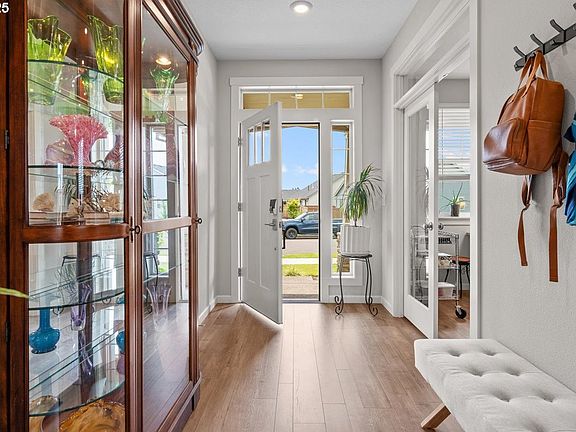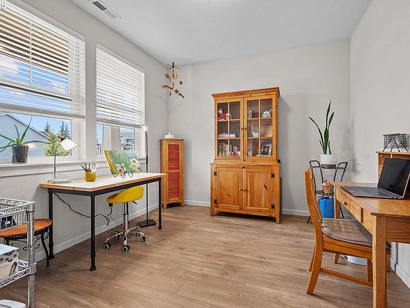 This lovely three bedroom in one of charming Canby's newer communities of Dodds Farm is better than new at two years old. Owner added lots of extras that were custom to the home including luxury vinyl throughout, ceiling fans, white ceilings throughout, custom painted white kitchen cabinets with full tile backsplash, custom built sideboard in dining area that matches the kitchen, storage/shelving units and extra freezer in garage. All kitchen appliances plus washer/dryer stay. The layout of this immaculate home is well done with french doors opening to a den/office/craft room located as you enter the home. Step further down the entry to a spacious great room with high ceilings and lots of natural as well as canned lighting. The white kitchen cabinets keep the area bright and fresh with a clear view to the back yard. The double pantry along with the custom built in sideboard in the dining area give ample storage for everything the home chef needs. The large primary suite has a walk in closet, step in shower, and double vanity. Two more bedrooms plus laundry area round this this easy living home. Fabulous location lets you take advantage of all that the surrounding Willamette Valley has to offer while at the same time enjoying life in the charming town of Canby. Immaculate and move in ready.