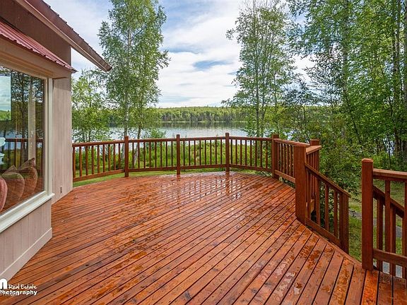 Beautiful lakefront home on Loon Lake just minutes from town in private setting. 235'+ of Lake frontage, bring your float plane! Inviting Floor plan has open concept kitchen, dining & sunken living room with amazing lake views & Alaskan feel! Master suite on first floor with tiled stall shower, custom cabinets, large walk in closet & door to sunroom! Large bedrooms & Baths! Welcoming entry with slate stone flooring. Guest bath with amazing lake view and plumbed for claw foot tub. Cozy kitchen, great for entertaining. First floor laundry room. Sunken living room with bay window and seating. Pine tongue and groove walls and ceilings. Exposed beams with big picture windows to bring in the lake view. Oak hardwood floors. Sunroom off dining area and first floor master suite. Large upstairs bedrooms have new windows and birch hard wood flooring. Roomy bathrooms remodeled in 2008-2009. Basement with access to back yard - perfect to store your kayaks! Water filter system and water softener. Dual heat - Oil & electric. Oil boiler with baseboard heat and electric forced air. 2 car garage and carport that can fit a 16' trailer. Nicely landscaped, crushed rock driveway. Loon lake stocked with Rainbow Trout Private shared driveway is in Alaska Railroad right away but permitted. 2.08 Acres but .99 taxable due to railroad right of way.