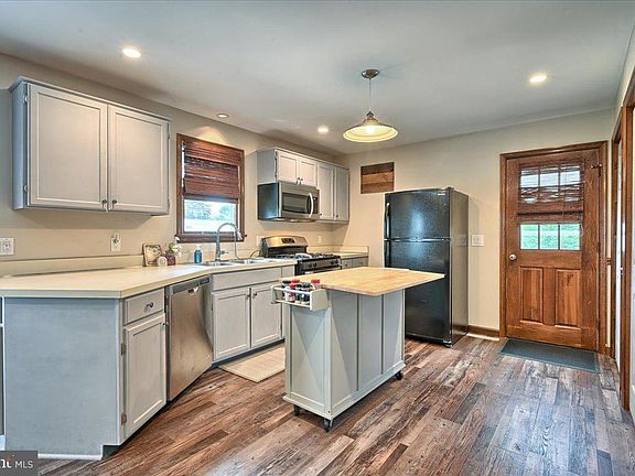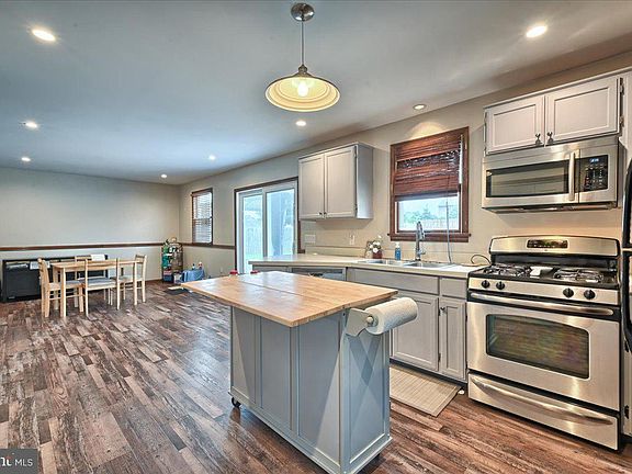 Enjoy one level living in this 2 BR ranch home with newer vinyl plank flooring, renovated bathroom, and oversized detached 2 car garage. The living room has a decorative wood accent wall and opens to dining area and spacious kitchen with gas range, microwave, dishwasher and pantry. Both bedrooms are 12x14, hall bath has double vanity with tub/shower, solid pine wood doors throughout, and main level laundry is behind bi-fold doors in kitchen area. Enjoy the private rear patio (gazebo will remain) overlooking flat rear yard with vinyl fencing. Detached 24x24 - 2 car garage has workbench and cabinetry and 100amp subpanel. Large concrete driving has room for 6 cars! Newer roof (2021). This home does not have a full basement, but a crawl space with concrete flooring (for storage) with access in hall closet.