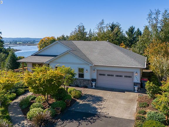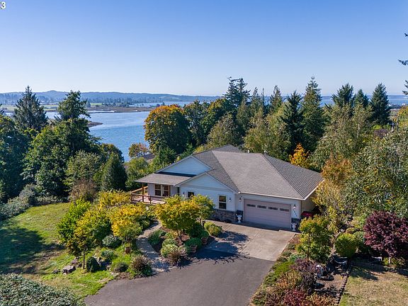Experience serenity with a picturesque view of Youngs Bay and seasonal vistas of Youngs River from the expansive living area, complete with generous bay windows, or unwind on your private wrap-around deck. This home was meticulously designed with entertaining in mind. From the soaring vaulted ceilings and a cozy gas fireplace in the main living room to the indulgent jetted tub, dual vanities, and a walk-in shower in the master suite, this property will transport you to a weekend getaway retreat. The lower level boasts two spacious bedrooms, a large bathroom with double vanities, and a splendid great room that leads to a patio surrounded by captivating landscaping within the prestigious Eagle Ridge subdivision