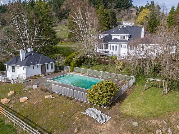 Exceptional Lake Oswego country property on 4.83 fenced acres w/private gate entry. Long private driveway to roundabout entrance, new 50 YEAR presidential roof, grand entrance w/high ceilings, dual staircases. Lg open kitchen overlooking territorial views, large spacious master on main w/fireplace & private patio, formal living rm w/fireplace & high ceilings. Large den w/wet bar. 625 sqft guest house & built in pool.