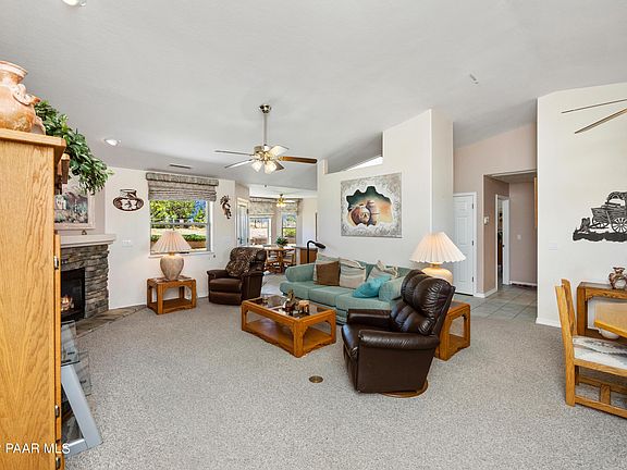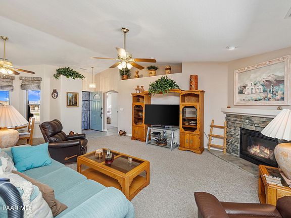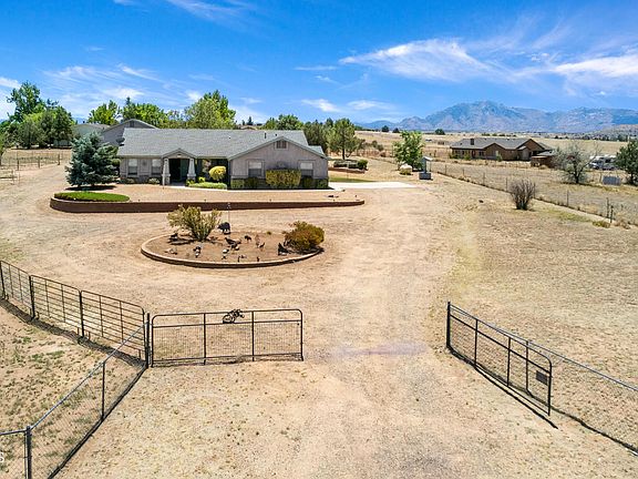 Cheerful rancher sits high with views to the north of San Francisco Peaks and Bill Williams from your covered front porch. Amazing backyard, breakfast views of Granite Mountain and state land. Great producing well and no CC&R's lets you enjoy life your way. Simple horse setup and riding access just yards away at state land. Home is handicap accessible. Detached 1004 sq ft garage, RV Barn with 3/4 bath and 512 sq ft workshp or potential guest house finish off the home with all you could need!