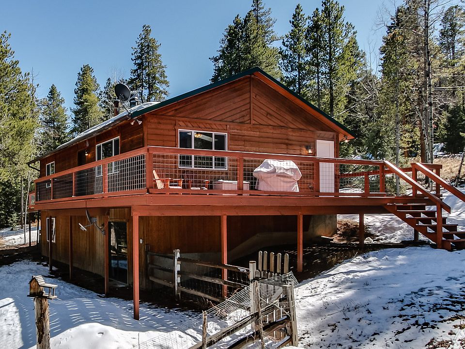 As you walk through the front door, a magnificent open great room greets you and takes your breath away in this lovely raised ranch home featuring beamed vaulted ceilings, gorgeous hand hewn wood floors, and a cozy wood stove insert with brick hearth. All the bedrooms in this house are oversized to accommodate lots of furniture or toys and both bathrooms have been updated. The lower level bedroom is large enough for a bedroom and home office in one. The walk-out lower level family room is warmed by an efficient pellet stove and ushers easy access to the huge fenced dog run. The large redwood deck has been expanded, allows access off the great room and captures the distant mountain valley views. This home has been well maintained and boasts new energy efficient windows. This gentle 1-acre lot is treed to ensure privacy and includes a gorgeous copse of Aspen. Commute to Denver either via Hwy 285 or down High Grade Road through Deer Creek Canyon.
