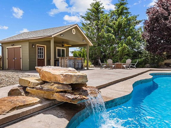 Stunning rural estate home on 2.64 acres with water acre rights in west Canyon County! This home offers breathtaking views and park-like yard featuring a 12x42 heated saltwater pool, rock waterfall, pool house/bar, fire pit, mature trees, and a horse pasture. Additionally, the property includes a 24x32 insulated/heated shop and storage loft, along with a covered 16x32 RV parking stall equipped with hookups for sewer, water, and electric. Inside, the home showcases exquisite interior highlights such as a chef's kitchen with custom-painted cabinetry, a butler's pantry, beautiful built-ins, and Acacia hardwood floors. The spacious 9-foot ceilings add to the elegance, while the primary suite boasts a generous walk-in closet. Upstairs, a roomy bonus room and half bath provides the perfect space for entertaining guests. With potential for an ADU or second home and ample space for horses and chickens, this property offers a unique blend of luxury and practicality. For more information on amenities, see the Docs tab.