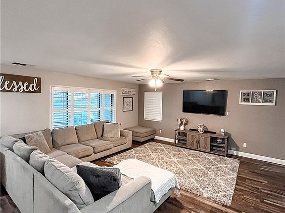 Each of the 3 bedrooms are oversized, freshly painted and carpeted with large closets. The main bedroom/bath renovation done just 3 years ago and is beautiful. The living space is beyond amazing. Let's start with, the grand kitchen. Upgrades include: 3-year-old quartz counter tops, farmhouse sink and appliances. Cabinetry paint and stone backslash just completed, includes large pantry and breakfast nook. The open concept main living allows for a very large dining area, accommodating many guests for gatherings. Opening to the warm and comfy living room, featuring a huge, whitewashed brick fireplace bringing so much warmth and character to the space with plantation shutters covering the large window. Flooring throughout is the lifetime vinyl installed 3 years ago. In addition, to entertaining there is an indoor bonus room leading out to poolside. The pool and deck were also resurfaced in 2019, offering plenty of patio seating options and outdoor kitchen. Beyond that, yes there is more....an additional 20x40 shop and separate rear yard surrounded by a block wall. Perfect for animals or a large home garden. This home also includes solar by Sun Run making it very affordable to operate heated pool/spa and cool and warm the large home. Isn't this enough introduction to make your showing appt now?? Lets make this your forever HOME!