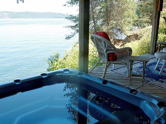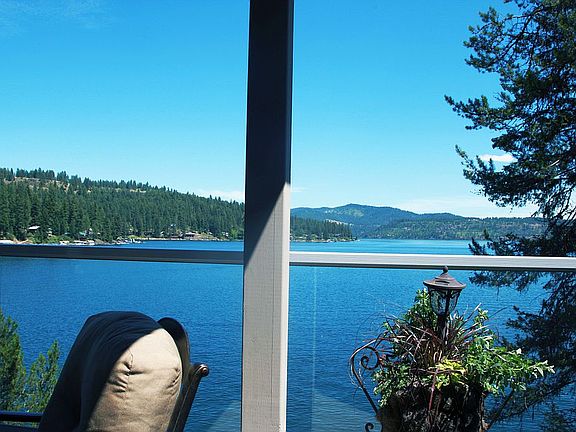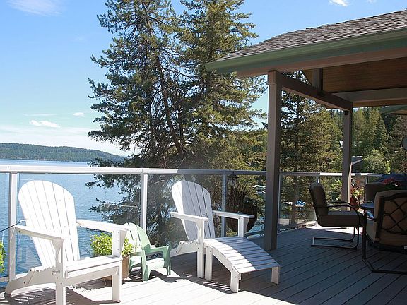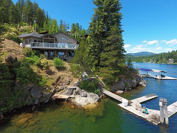 Coeur d'Alene Lake, Rockford Bay, 125' frontage, 4 bdrms, 3.5 baths, 3200 sq ft custom rancher, daylight basement, high quality kitchen, extensive decking. One of the Best Values on the West Side of the Lake in Popular ROCKFORD BAY! 125’ of Deep Water Frontage; Perched on a point overlooking Rockford Bay with unobstructed 180 degree views of Rockford Bay and Shooters Marina, a favorite of local places to dine on the lake! This 4 bed; 3.5 bath; 3200 Sq Ft is a GREAT summer or year-round home!Fabulous Sunsets! Remodeled with High-End Kitchen and Cabinetry; Golf nearby at Circling Raven (Public); or Rock Creek (Membership). Take a look at the VIDEO!