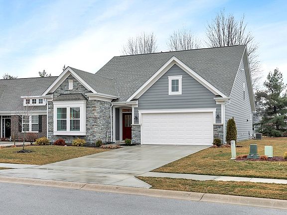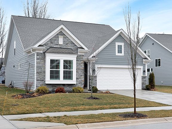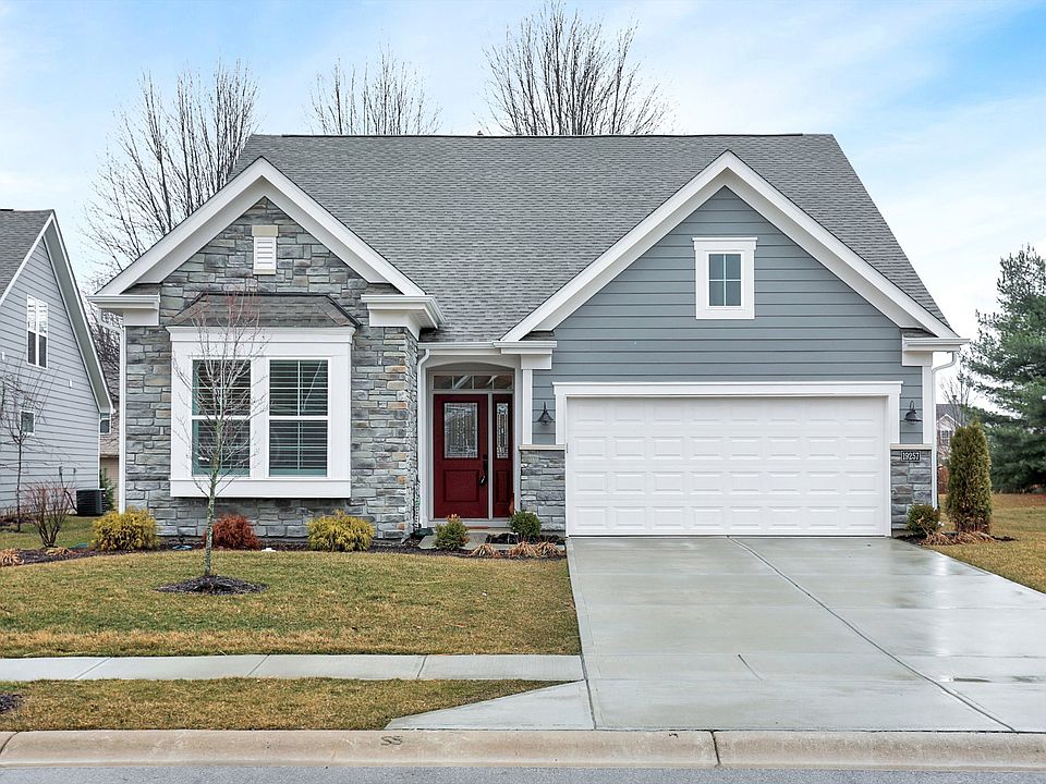 Welcome to this stunning Noblesville home that offers a low maintenance lifestyle and boasts nearly new construction. This beautiful single owner property features 3 bedrooms, including a main floor primary suite with tray ceilings and spacious walk-in closet. Upstairs you will find a loft and additional bedroom, as well as storage room. A main floor office provides ample space for work or relaxation. The open and bright kitchen with large center island overlooks the breakfast nook and family room. The floor to ceiling stacked stone fireplace is the centerpiece of the home. 9' ceilings throughout main floor. An expansive deck offers a serene outdoor living space with views of the surrounding tree line.