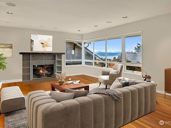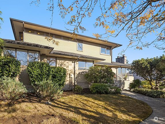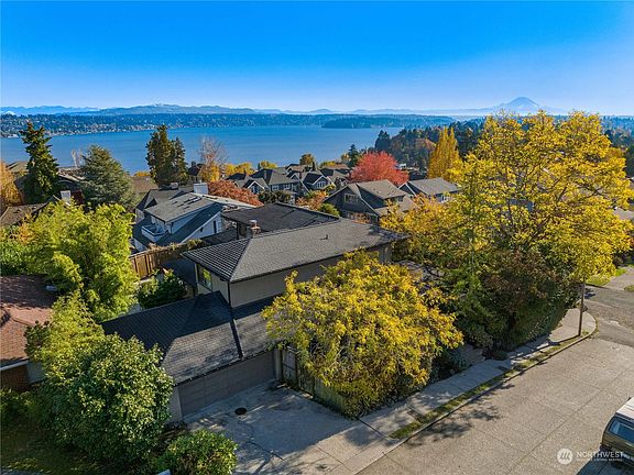 Impressive contemporary home on lovely corner lot with sweeping Lake Washington, Cascade Mtn & Mt Rainier views. Functional+ flexible with bright open living areas - living room with wall of windows to frame the lake views + huge sunny deck for entertaining. Open updated kitchen is the hub of the home w/large island, breakfast nook & built-in desk. Main level 2BRs + full bath. Expansive upper level captures light and views w/ 2 lg BRs, full bath w/tile shower, huge walk-in closet. Daylight lower level has family room w/fireplace, kitchenette, ¾ bath, exterior entry. Two car attached garage with EV charger. Privacy abounds on large lot w/lush landscaping + friendly neighborhood with easy access to lake, parks, amenities and transit.