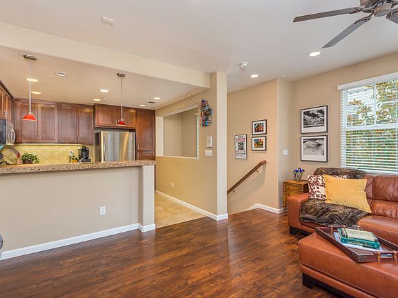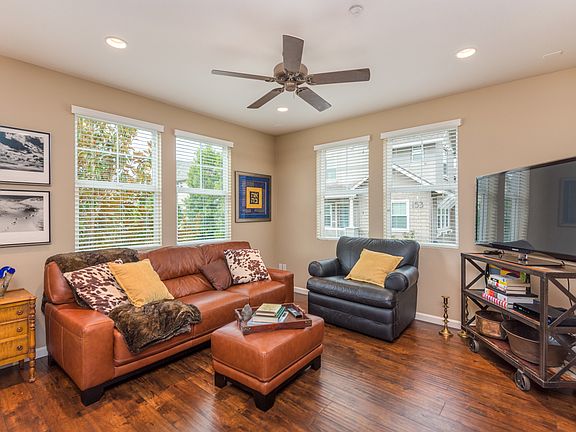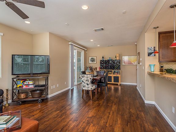 Seeking a location that offers city life in an urban setting? Pristine end unit with extra sunlight. Convenient street level front door entry. Two cozy separate balconies off of family room and master bedroom is ideal along with custom bedroom closet organizers. Gorgeous engineered wood flooring throughout with nice neutral color scheme. Kitchen with granite counter, stainless appliances and porcelain tile flooring. Nicely updated bathrooms with tile flooring, upgraded cabinets and modern conveniences. Tandem two car garage with extra storage. Location is ideal for walking to downtown shops and restaurants. You are a quick bike ride away from South Livermore valley trails. This location is popular for those seeking a modern urban lifestyle.