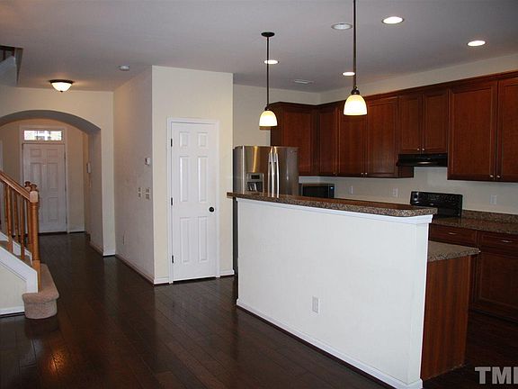 All brick two-story cul-de-sac townhouse in Amberly w/ 3 BR+2.5 BA & 1-car garage away from the hustle & bustle of the neighborhood. Close to RTP, RDU, easy access to I-540/64/55. Open floor plan w/ hardwood throughout 1st floor, 42" cabinets, flat-top range, recessed lighting in kitchen. Bronze hardware throughout. Ceiling fans in master & living room. Great view of wooded backyard w/ patio near the walking trail. Lawn & exterior maintenance along with a fabulous clubhouse & pool included in HOA dues.
