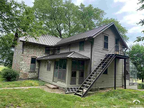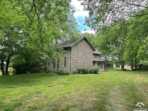 Unique opportunity for a private country property just North of Lawrence. LAWRENCE SCHOOLS: Woodlawn Elementary, Liberty Memorial Central Middle School and Free State High. Rustic stone house with kitchen addition, 3 bedrooms, 2 baths, and unfinished basement. Sun porch with jacuzzi and shower. Exterior stairs to Studio or access from second floor. Fantastic hardwood floors and charm of an older home. Approximately 11.68 acres includes an elevated shady homestead with Barn and other buildings.
