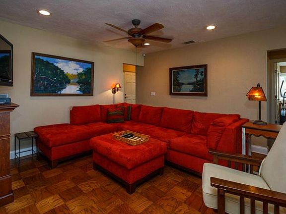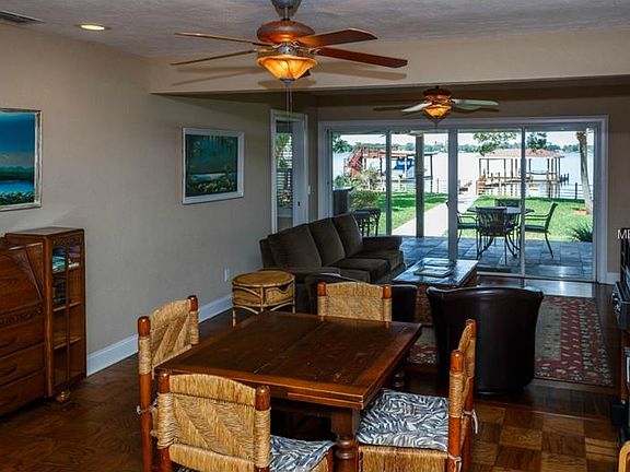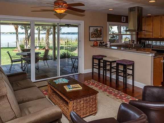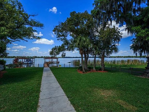 Unique lake front property on 2 lakes. 4 Bedrooms and 2 bathrooms ( 1893sf). Great room living/dining area plus bonus room. French doors, pocket doors and recess lighting. New kitchen has granite counter tops with breakfast bar and walk in pantry. Stainless appliances include; cook top with hood, double wall ovens, French door refrigerator, microwave and dishwasher. Walk in pantry. Parquet and hardwood flooring throughout. Secondary bathroom has Jacuzzi tub. Recent updates include new; A/C, roof and windows. Covered back porch has brick wood burning fireplace with ceiling fans and slate flooring. Summer kitchen has stainless grill and cook top. Boat dock/lift equipped with low voltage lighting, misters, shower, 3 drop down cabanas and Aluminum ladder. Concrete sea wall. Fenced back yard with mature Palm and Oak trees, circle drive way and oversized 1 car garage. 70Ft frontage on Lake Cannon with 11 Ft extension to Lake Howard.