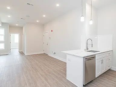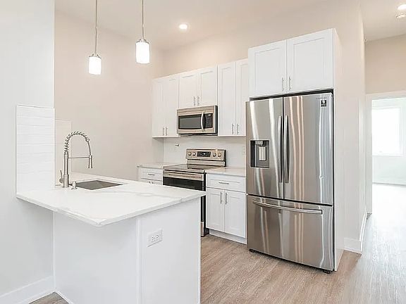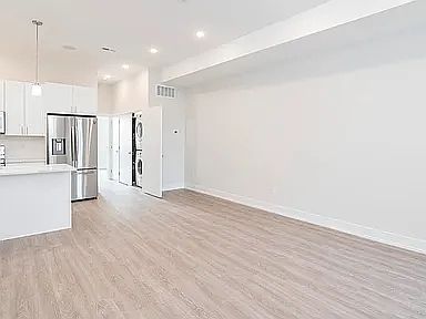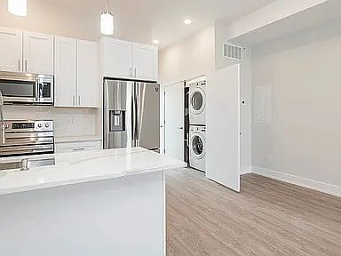 Modern New Apartment with In-Unit Laundry and Contemporary Finishes Experience luxury living in this beautifully designed apartment featuring an open concept layout and sleek modern details. The bright kitchen offers stainless steel appliances, quartz countertops, white shaker cabinetry, and pendant lighting over a breakfast bar, perfect for cooking and entertaining. The spacious living area boasts high ceilings, recessed lighting, and large windows that fill the space with natural light. The bedroom provides a cozy retreat with plenty of natural light and stylish flooring. The bathroom showcases elegant tile work, a full tub, and updated fixtures for a clean, spa-like feel. Convenience meets comfort with an in unit washer and dryer, central air, and energy efficient appliances throughout. With its modern design and prime location, this apartment offers the perfect balance of style and function for contemporary city living.