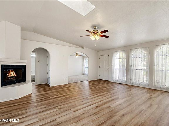 Perched in a central Prescott location with sweeping views of the surrounding hillsides, this single-level home has been beautifully maintained. Proudly offered by the original owner and used only as a 2nd home, it has been very gently lived in and meticulously cared for since its construction. The exterior sets the tone with clean, classic curb appeal and a spacious covered deck that spans the entire length of the home, an ideal setting for outdoor dining, entertaining or simply soaking in the panoramic vistas. Inside, you're welcomed into a bright & airy living room where vaulted ceilings, large windows and skylights fill the space with natural light. A cozy corner fireplace adds warmth and charm, while new luxury vinyl plank flooring and fresh carpeting provide a modern, updated look. Flowing seamlessly from the living area, the kitchen and dining room are perfectly positioned to capture the surrounding views. Ample cabinetry, clean lines, and an intuitive layout make this space as functional as it is beautifulideal for both everyday meals and special gatherings.The primary suite is a peaceful retreat, featuring direct access to the expansive deck through sliding glass doors. The room includes a large closet and an en-suite bathroom with dual vanities and a walk-in showercomfort and convenience at its best.The guest bedroom on the main level is equally inviting, offering beautiful views and easy access to a full bathroom. A spacious office or additional family room provides flexibility for work, hobbies, or media use.Downstairs, guests will enjoy their own private space complete with a generous family room, a full bathroom, a large bedroom, and a convenient wet bar. A sliding glass door opens to the backyard, allowing for easy outdoor access and scenic views from every angle.Additional storage is available throughout the lower level and in the oversized two-car garage. The neighborhood offers a low-cost HOA that maintains a high standard of quality and amenities including a dedicated RV parking area for residents.A landscaped, low-maintenance backyard completes the outdoor experience, offering serenity with minimal upkeep.This home is a rare find: lightly lived in, thoughtfully designed, and located in one of Prescott's most desirable areas. All that's missing is you.