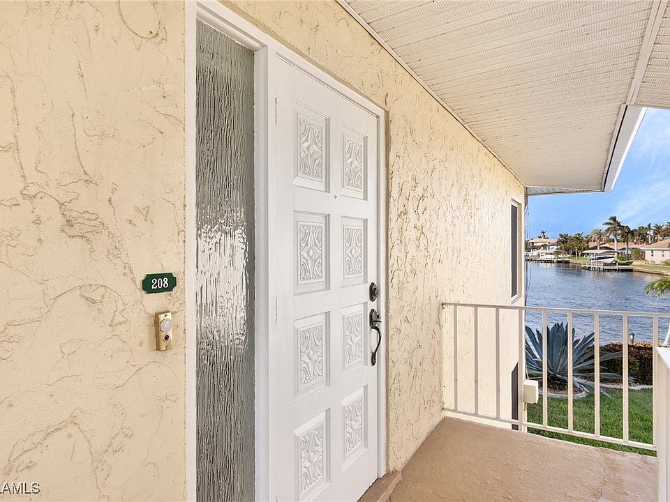 This beautifully updated second floor two-bedroom condo offers stunning water views of the 200-foot-wide intersecting Plato and Primrose canals, as well as partial views of the serene Caloosahatchee River. The open floor plan features a modern kitchen with granite countertops and updated appliances, flowing into a sunlit living area. Relax and have your morning coffee or tea on the lanai which includes an outdoor kitchen and wet bar. Steps away from popular Jaycee Park this condo complex has healthy reserves and recently installed standing seam metal roofs of the condo, carport and 5'x8' storage area ensuring longevity. Water, sewer and trash are included in the HOA fee. Impact resistant windows enhance the bedrooms. The primary suite boasts a private bath with tile wainscoting and a walk-in closet. Since this unit is on the second floor it has never flooded. Recent interior upgrades including: primary bathroom 2021, guest bathroom and kitchen in 2023, and crown molding installed in the living room, dining area, kitchen and hallway in 2024. While equipment updates include new water heater 2021, A/C, stove and microwave 2022, and refrigerator 2023. Amenities like a community pool and an assigned boat dock for up to a 30-foot boat make for coastal living at it finest.