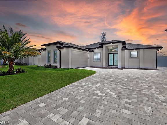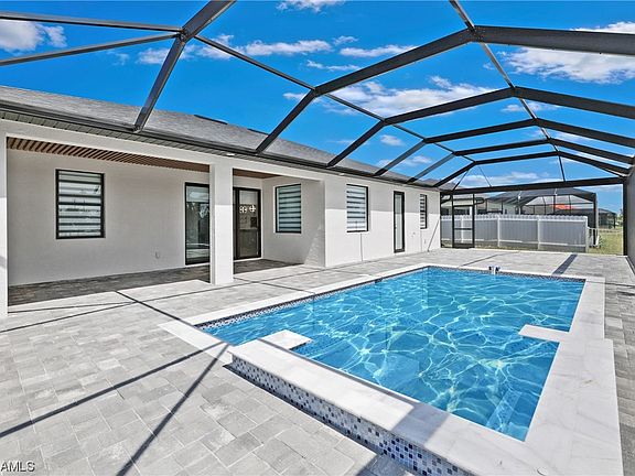 Beautiful Waterfront this spectacular POOL HOME located in the desirable area of SW Cape Coral JUST MINUTES WALKING FROM PALMETTO GULF COURSE ,The open concept offers 1910 sq.ft of fabulous living area, tray ceilings, HURRICANE IMPACT DOORS & WINDOWS, custom contemporary cabinetry, quartz countertops, zebra blinds with privacy , you can walk to the palmetto golf course . TILE THROUGHOUT! Paver driveway & pool deck. When you view the pictures you will see all the upgrades this new home has to offer. 5 1/4"base & 3 1/4"casing. 8 ft. Large paved lanai area , a pool cage has fabulous picture window for unobstructed water views. AMAZING LANDSCAPING! . Spacious family room with feature wall & fireplace. East Exposure for sunsets & afternoon sunlight on the Resort Pool Spa and with a salt system, and sun shelf for sunbathing, BOATERS very close to Matlacha for wet & dry boat storage, boat rentals, restaurants, dining, events. Just enough room to start a family or to retire to with all the extra storage!