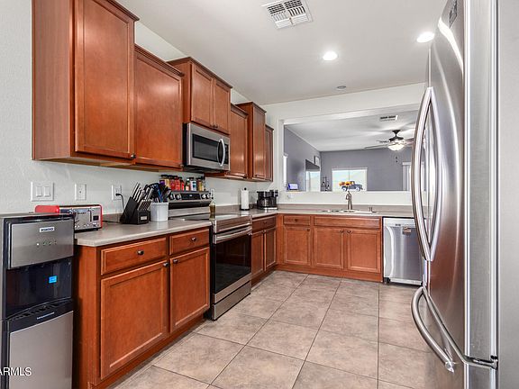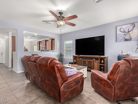Energy-efficient 3-bedroom, 2-bathroom home. Step inside to a living room bathed in natural light, w/ elegant tile flooring & sliding glass doors leading to the back patio. The eat-in kitchen features beautiful staggered cabinets w/ crown moulding, SS appliances, & recessed lighting.The primary bedroom has a spacious walk-in closet & a private bathroom w/ a combination shower & tub.The expansive backyard includes a covered patio & a convenient storage shed, perfect for entertaining or enjoying the outdoors.This home is designed for energy efficiency w/ a fully PAID-OFF solar system, 2020 AC unit, a Ring camera for security, 2022 soft water system, & a keyless front door lock. The RV gate and gated courtyard provide added convenience and privacy. VA Assumable 2.25% ENTITLEMENT required.