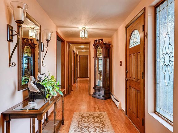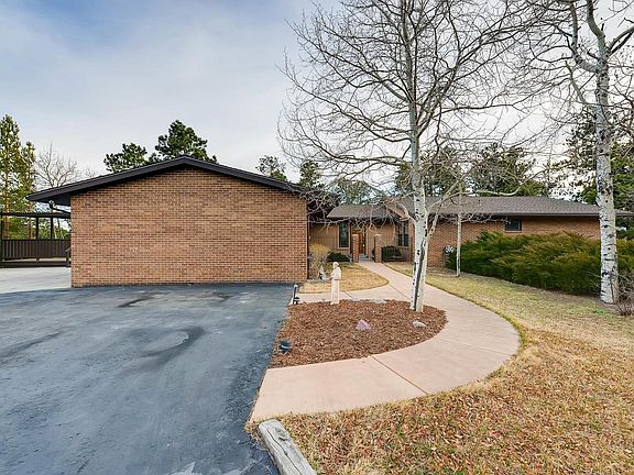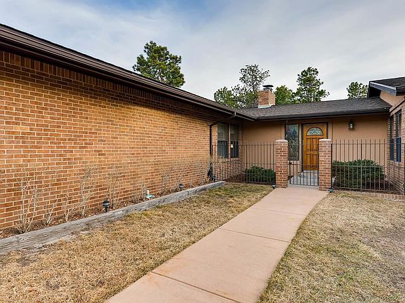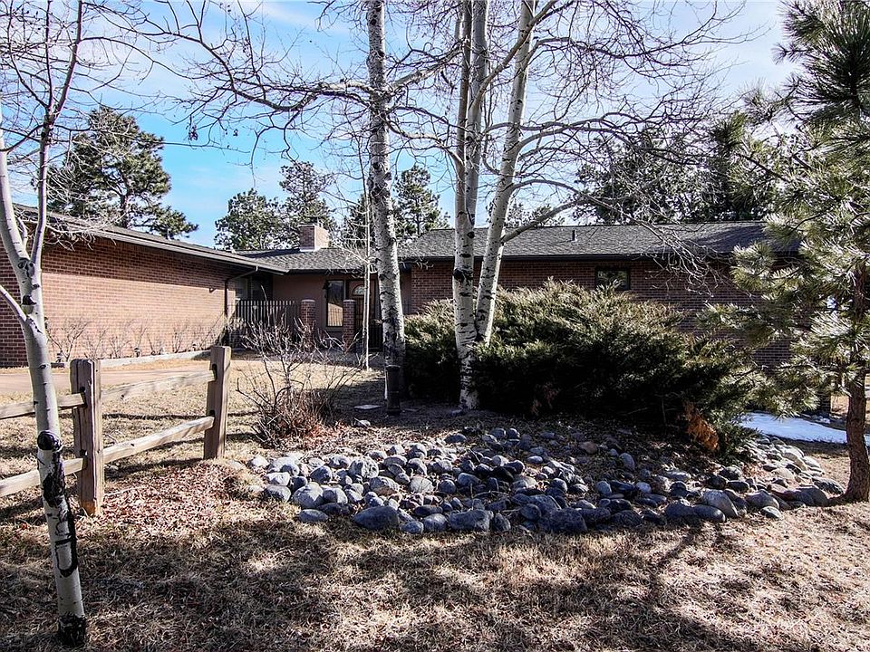 Close to Denver & Colorado Springs. Immaculately maintained walk out ranch with two patios and a large deck that take advantage of the private lot with trees and views of Pikes Peak and the mountain range. The golf course is within a minute's walk. A private courtyard welcomes you, and the entry divides formal and informal areas. The huge great room with vaulted, beamed ceiling, a wall of windows and beautiful fireplace is adjacent to the separate dining room with built-ins. A large kitchen with solid surface counter tops, an abundance of cabinets, pantry and large breakfast nook opens to the outside. The bedroom wing houses two good size bedrooms plus a large master suite with walk-in closet. The lower level walk-out offers a large game room with Timberline stove and a wall of windows. There is a separate, partial kitchen, plus a 20'x15' bonus room, another bedroom and a bath on this level. The home has hot water heat. 5th bedroom possible.