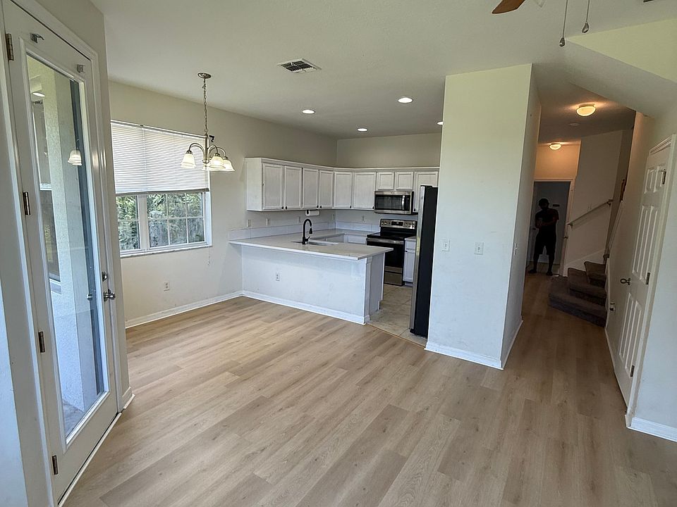 Living Room: Beautiful new hardwood flooring adds warmth and elegance to the open-concept living area.