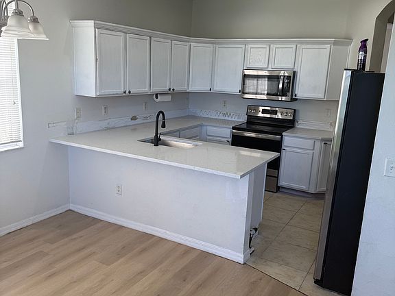 Newly Renovated Kitchen: Features stunning white granite countertops, white cabinets, stylish new faucets, and updated appliances with plenty of counter and storage space.