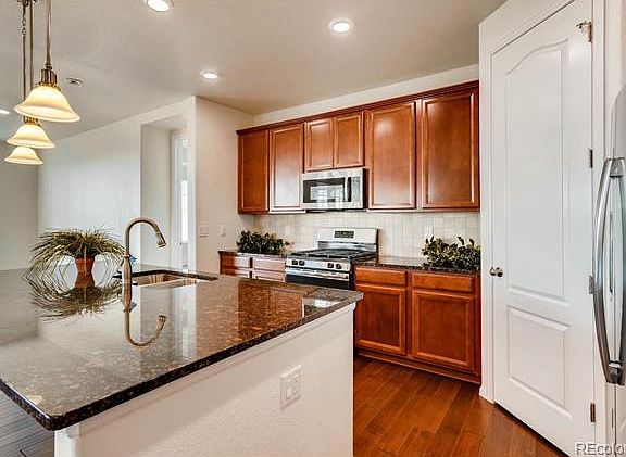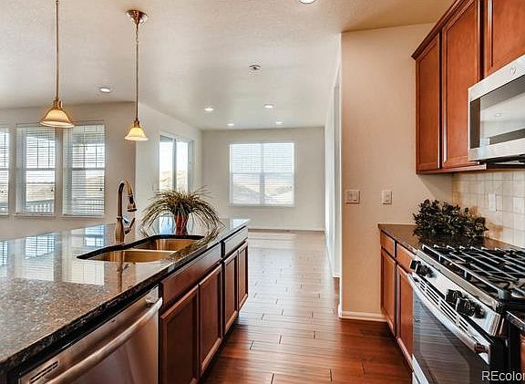 Welcome to the majestic and rural beauty of northwest Arvada in this luxurious & functional Lennar home. Gorgeous hardwood flooring lures you into the home & is extended through the family room & into the kitchen w/ the perfect floor plan for entertaining. The kitchen showcases maple cabinets w/ crown molding, granite countertops w/ cascading glass back splash, walk-in pantry, and stainless appliances. The 5 piece master bath includes granite countertops w/ double sink vanity. Brushed nickel fixtures, 9 ft ceilings & 2 in faux wood blinds accentuate the splendor of this home. If you desire privacy, relax on your covered deck knowing that over 65% of Leyden Rock is dedicated to open space with over 17 miles of trails for your enjoyment. Your front and rear landscaping is included! Leyden Rock offers neighborhood parks, pools & an amazing clubhouse. This home is nearing completion in January and won't last long.