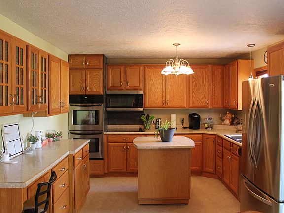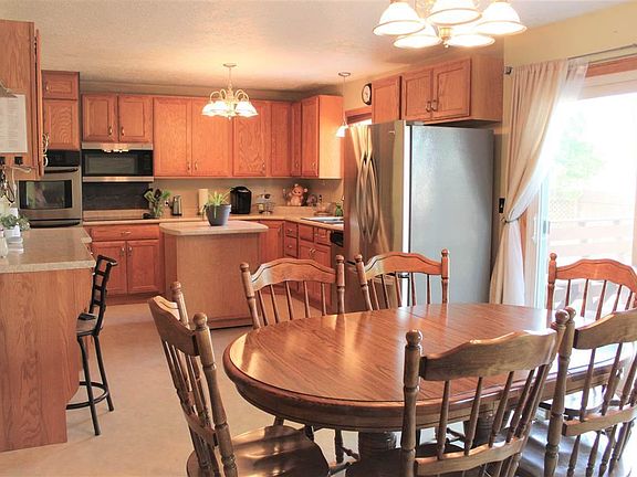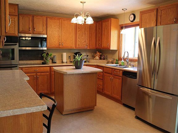 Move-in ready is this immaculate home! Landscaping was accomplished a few years back to include a waterfall feature (see remarks). The main level features a laundry room (gas dryer) off the hallway, 3 bedrooms, open concept with spacious living room, dining room, 1 main bath and 3/4 bath in master bedroom, and a kitchen with stainless steel dual wall ovens, refrigerator, glass top electric stove and microwave plus a little desk area. The lower level will greet you with a large rock wood burning fireplace, good size family room that offers a pool table area and a bar, plus an added bonus--a theatre room with 180" screen and projector that will convey with the property, 2 bedrooms with non-egress windows and electrical hookups for an additional laundry room. Roof replaced 2019, and newer windows and garage door. The beautiful privacy fenced backyard is accessed from the dining room patio door that leads you to a large deck surrounded with benches. The garage is heated with a good size workbench area. Home is hot water heated but seller has had a Daikin minisplit wall unit installed, which produces air conditioning and heating. Pool table and freezer also convey with the property.