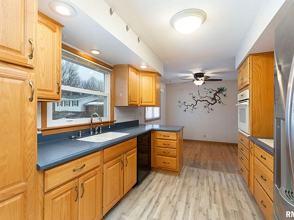 This quad-level house in Bettendorf is the perfect place to call home! Located at the end of a cul-de-sac with great curb appeal, it also has beautiful hardwood flooring throughout a majority of the home. Walk into the main level and find the large kitchen with a built-in oven and informal dining area. The large 22 x 12 living room has a large picture window looking out to the secluded backyard. On the upper level, you'll find the four bedrooms and one and a half bathrooms. The lower level has a 16 x 10 rec room with a storage closet and the laundry room, with an extra half bathroom. Check out the finished basement that offers a free-standing, wood burning fireplace and a built-in bar for entertainment! This is a must-see home!