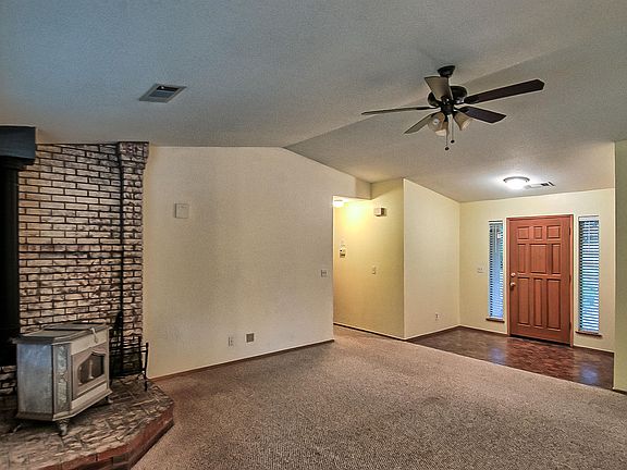 Unique Home in nice neighborhood. Living room with corner brick hearth and wood stove. Kitchen with center island and breakfast bar. Small office area just off kitchen. Huge covered patio and workshop in back.