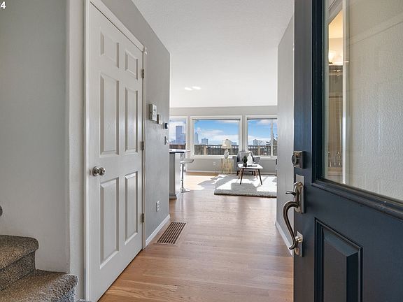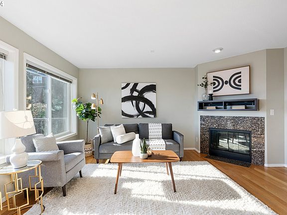 Stunning updated Goose Hollow townhome! This townhouse-style condo combines all of the elements you are looking for - location, floorplan, views, and easy living! Come and see the amazing view of downtown Portland and Mt Hood! Breathtaking views of the city and yet still private (no one lives above or below you). Versatile floorplan has 2BR/2.5 baths, a large open dining room and living room combo with high ceilings. Features include an open kitchen with quartz countertops, cook island, and stainless steel appliances. Hardwood floors, gas fireplace in living room. Primary suite with soaking tub, generous walk-in closet. Second bedroom also upstairs. This home has the perfect spaces to work from home. Remodeled bathrooms, newer fixtures, nice updates. Attached two car garage gives you plenty of parking (there are two guest spots down as well). Don't let the steep driveway scare you, it is a non-issue and access is easy once you are at the property. Easy commute to MAX station and downtown, plus the 405 and hwy 26. Minutes away from Timbers stadium, restaurants, and shops on NW 23rd. [Home Energy Score = 10. HES Report at https://rpt.greenbuildingregistry.com/hes/OR10162044]