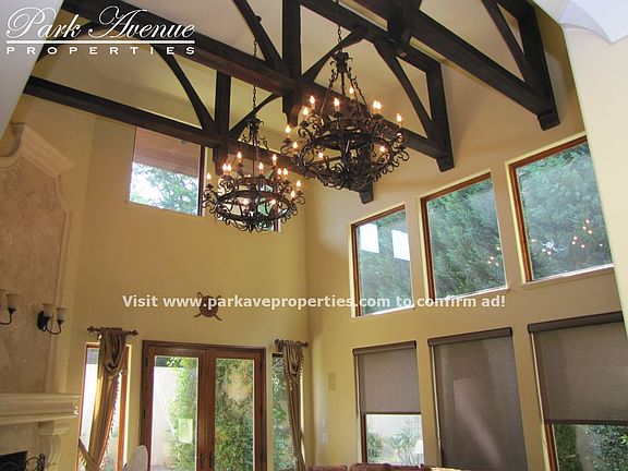 This custom-built Spanish villa is fit for a king and queen! The exquisite detailing must be experienced by visiting the home. Onyx, granite, marble, ironwork and faux finishes adorn the home throughout. Custom chandeliers, a spiral staircase, vaulted ceilings, floor to ceiling windows, hanging wood beams add to the luxury of the home. The center of this villa is its 1,200 sq. foot courtyard with built-in fireplace! Romanesque columns and diamond-shaped layed stone highlight the area with plenty of space for seating to relax and/or entertain. The main floor boasts 2 bedrooms and 2.5 bathrooms (the Master Suite is luxurious), living room, formal dining room, chef's kitchen, breakfast area and laundry room. The upper level does not disappoint with 3 bedrooms, 2.5 bathrooms, a bonus room, playroom and media room (with full screen, projector and leather captain chairs). A gated community with established landscaping, it features a pool and playground. Come visit this outstanding home to fully grasp the custom Mediterranean detailing!Landscaping maintenance included.